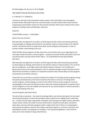 نمای کلی سیستم کوپن آموزشی در ایالات متحده را ارائه می دهد. چگونه این برنامه بودجه عمومی را برای خانواده ها فراهم می کند تا در مدرسه دولتی یا خصوصی مورد نظر آنها استفاده شود. چگونه این برنامه به والدین کنترل بهتری بر آموزشی که فرزندشان دریافت می کند، می دهد. جزئیات برنامه کوپن در کلیولند، اوهایو و میلواکی، ویسکانسین. (46500 نشانه)