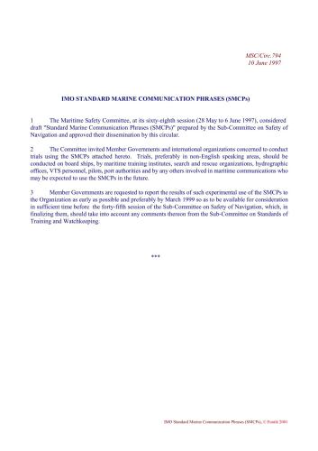 از دولتهای عضو درخواست میشود که نتایج این استفاده آزمایشی از SMCPها را در اسرع وقت و ترجیحاً تا مارس 1999 به سازمان گزارش دهند تا برای بررسی در دسترس باشد. زمان کافی قبل از چهل و پنجمین جلسه کمیته فرعی ایمنی دریانوردی که در نهایی کردن آنها باید هر گونه نظر کمیته فرعی استانداردهای آموزش و نگهبانی در مورد آن را در نظر گرفت.