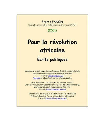 ”نسخه الکترونیکی تهیه شده از متن فرانتس فانون، برای انقلاب آفریقا. نوشته های سیاسی. پاریس: Éditions La Découverte, 2001, 228 pp. [Re]découverte مجموعه، اسناد و مدارک. دختر، امیلی ترمبلی، دانشجوی دکترای جامعه شناسی در دانشگاه مونترال.