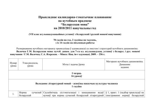 تقویم کاربردی و برنامه ریزی موضوعی برای موضوع زبان بلاروسی برای سال تحصیلی 2010/2011 (کلاس هفتم موسسات آموزش عمومی با زبان های آموزشی بلاروسی و روسی). 70 ساعت در سال |