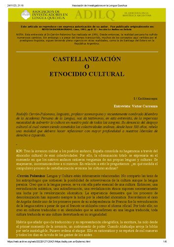 | عنوان اصلی | Castellanización o etnocidio cultural. Entrevista a Rodolfo Cerrón-Palomino [1991] |