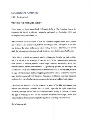 این صفحات به کتاب Coloquial Amharic نوشته دیوید اپل یارد، که در اصل توسط Routledge 1995 منتشر شده است، پیوند داده شده اند و همراه با نسخه اصلاح شده 2012 هستند. این یک بحث نیست. نحوه عملکرد خط اتیوپیایی (یا fidäl) که در کتاب دوره یافت می شود، اما بهترین روش برای تشکیل حروف خط هنگام نوشتن با دست را به شما ارائه می دهد.