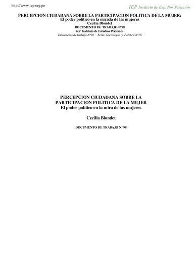 آیا می توان از عقل سلیم جدیدی صحبت کرد که نقش های جدیدی را برای زنان در عرصه عمومی بپذیرد؟ نظر جامعه درباره حضور روزافزون زنان در عرصه سیاست چیست؟ nقانون سهمیه در انتخابات بعدی، موسسه مطالعات پرو نظرسنجی تنظیم کرد که ایماسن در دسامبر 1997 در لیما و در سه شهر استان (Iquitos، Arequipa و Huancayo) در مارس 19982 اعمال کرد و نظرات را جمع آوری کرد. مردان و زنان در طبقات و سنین مختلف اجتماعی در مورد مسائل مشارکت زنان در سیاست.