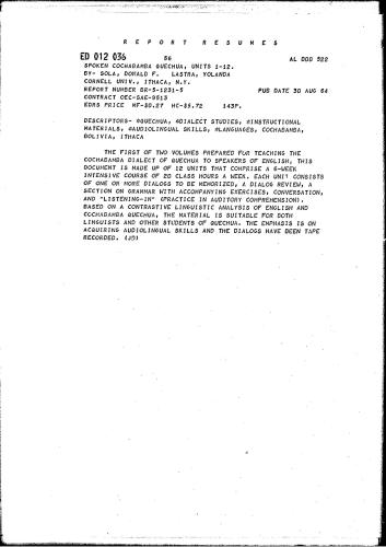 اولین جلد از دو جلد آماده آموزش گویش کوچابامبای کچوا به انگلیسی زبانان، این سند از 12 واحد تشکیل شده است که شامل یک دوره فشرده 6 هفته ای 20 ساعت کلاس در هفته است. هر واحد شامل یک یا چند دیالوگ است که باید به خاطر بسپارید، یک مرور گفتگو، یک بخش در گرامر با تمرین‌های همراه، مکالمه و “Listening-in” (تمرین در درک شنیداری). بر اساس تجزیه و تحلیل زبانی متضاد انگلیسی و کوچابامبا کچوا، این مطالب برای زبان شناسان و سایر دانش آموزان کچوا مناسب است. تاکید بر کسب مهارت های شنیداری زبانی است و گفتگوها ضبط شده اند.