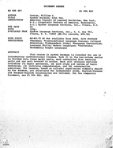 این دوره به زبان برمه ای گفتاری برای کلاس های مکالمه مقدماتی در نظر گرفته شده است. کتاب دوم در مجموعه دو جلدی به سه بخش عمده تقسیم شده است که هر بخش شامل پنج واحد آموزشی و یک واحد به بررسی اختصاص یافته است. هر واحد شامل بخش هایی شامل جملات اساسی، مطالعه کلمات و مرور جملات اساسی، درک شنیداری و تمرینات مکالمه است. درس‌ها، بر اساس تجربیات فرهنگی که معمولاً توسط برمه‌ها به اشتراک گذاشته می‌شوند، برای مطالعه مستقل ساختار یافته‌اند. واژگان انگلیسی-برمه‌ای و برمه-انگلیسی گنجانده شده‌اند.